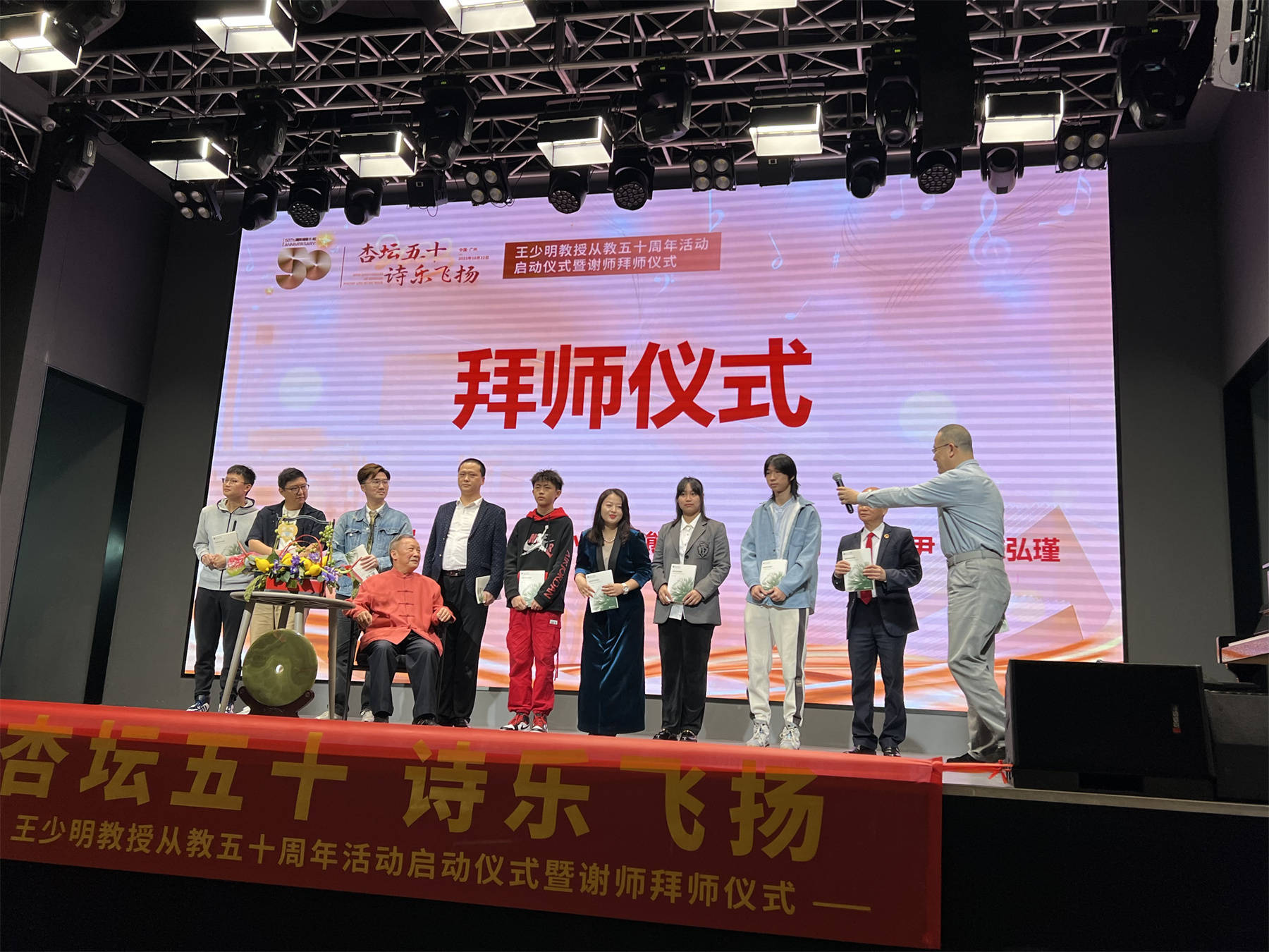 2023年10月22日上午10时,由广东省文化学会主办、广州市音乐家协会承办、星海音乐学院音乐学系、五音国际艺术教育协办的“杏坛五十,诗乐飞扬”——王少明教授从教五十周年活动启动仪式暨谢师拜师仪式在岭南音乐馆隆重举行。到场致辞庆贺的有文化界、教育界专家、学者及王少明教授的家人好友、历届学生代表。本场启动仪式由中流会创始人、富有幽默感的姚军先生主持。