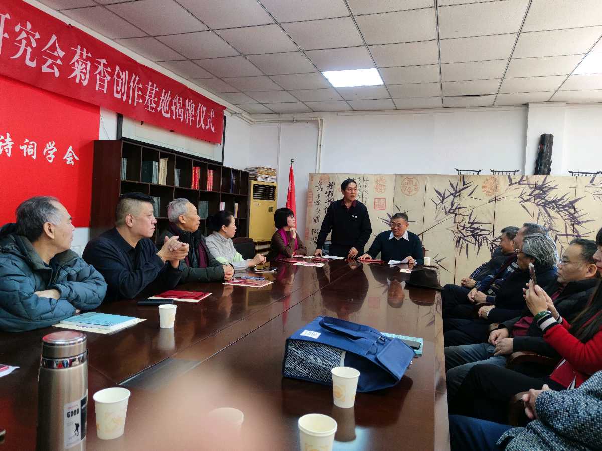 会议由菊香创作基地秘书长白根山主持,天津市老年书画研究会书记刘传光和天津市诗词学会会长李军为菊香创作基地揭牌。菊香创作基地副主任王振中宣布了组织名单