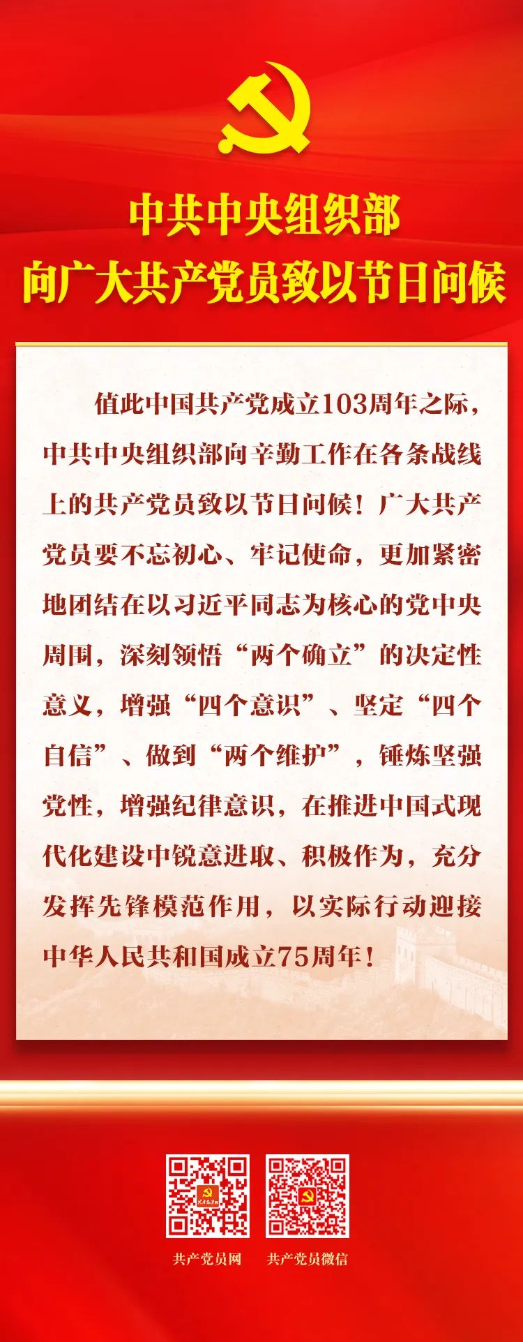 【建党节】中共中央组织部向广大共产党员致以节日问候