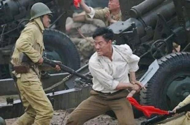 伴随着激战的画面,在《大刀进行曲》落音之后,响起铿锵有力的豪放诗朗诵声: