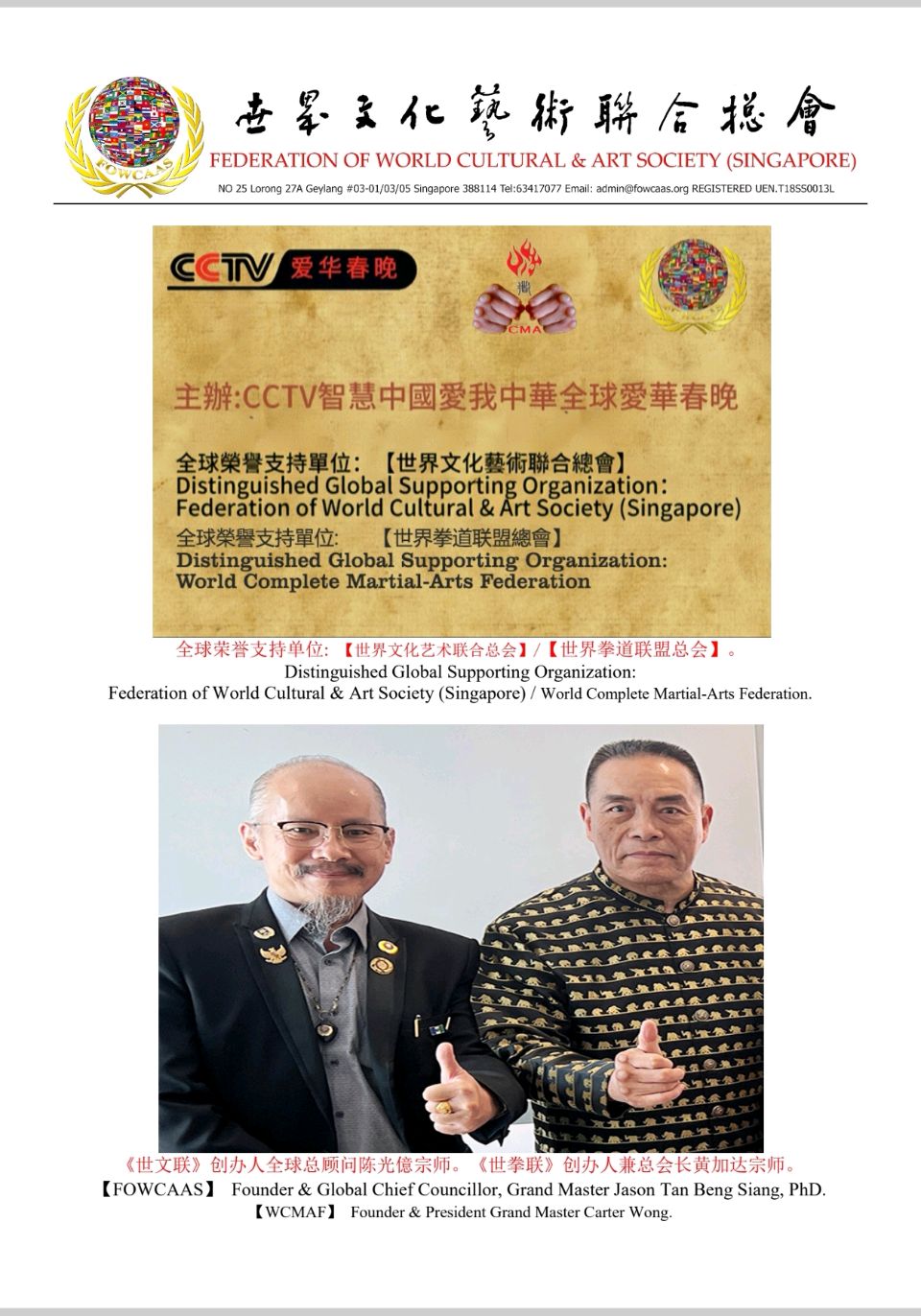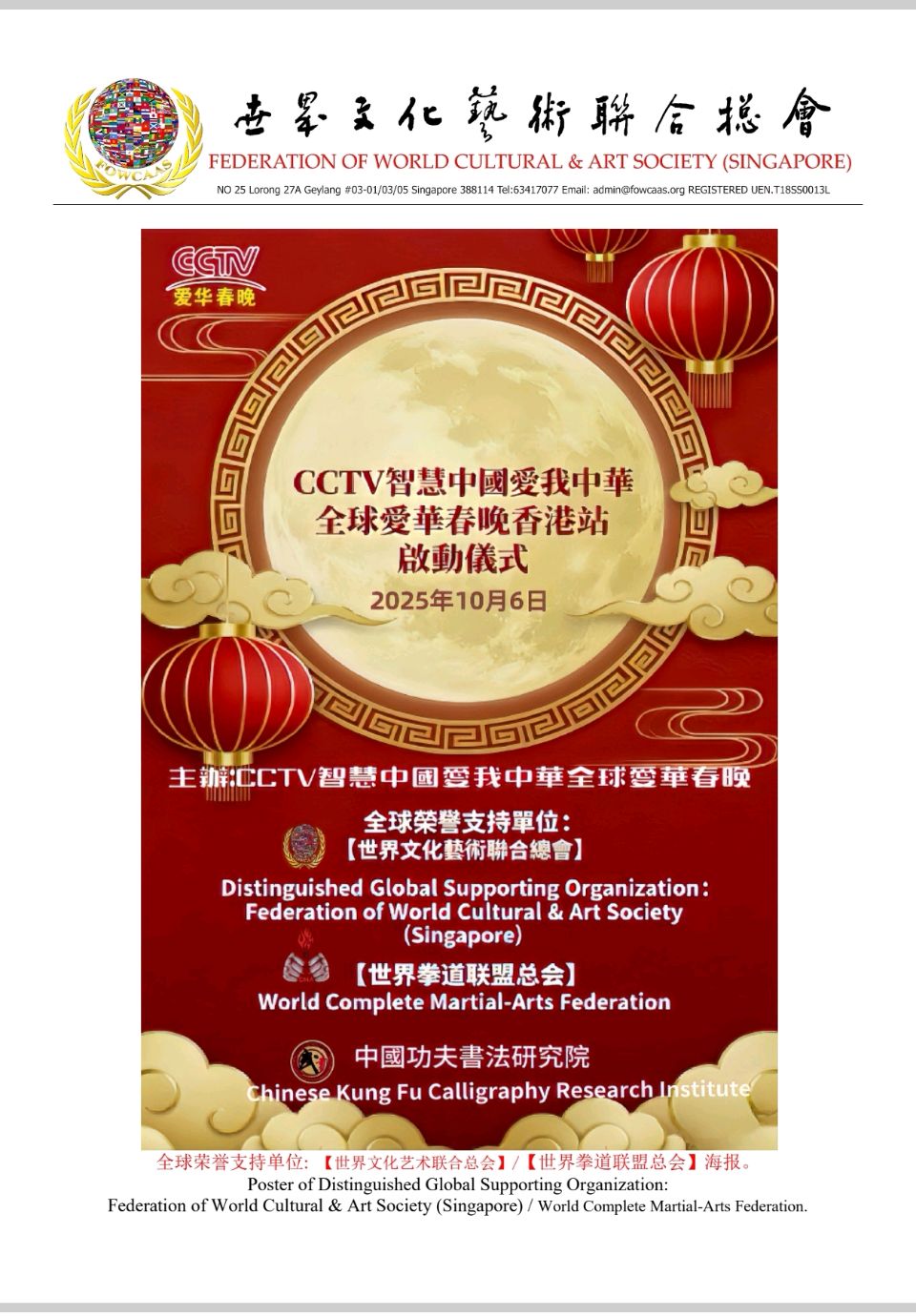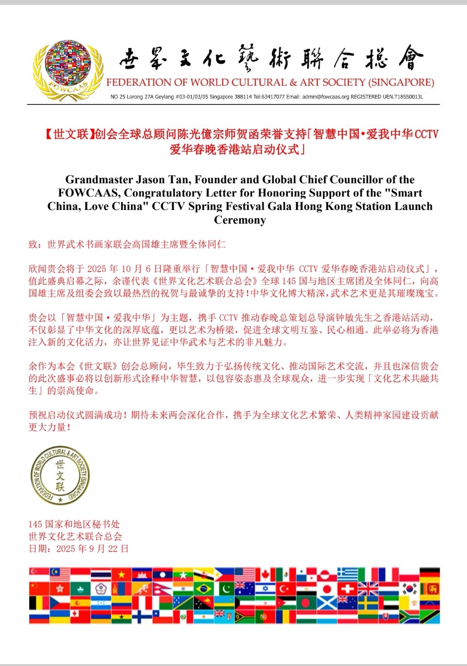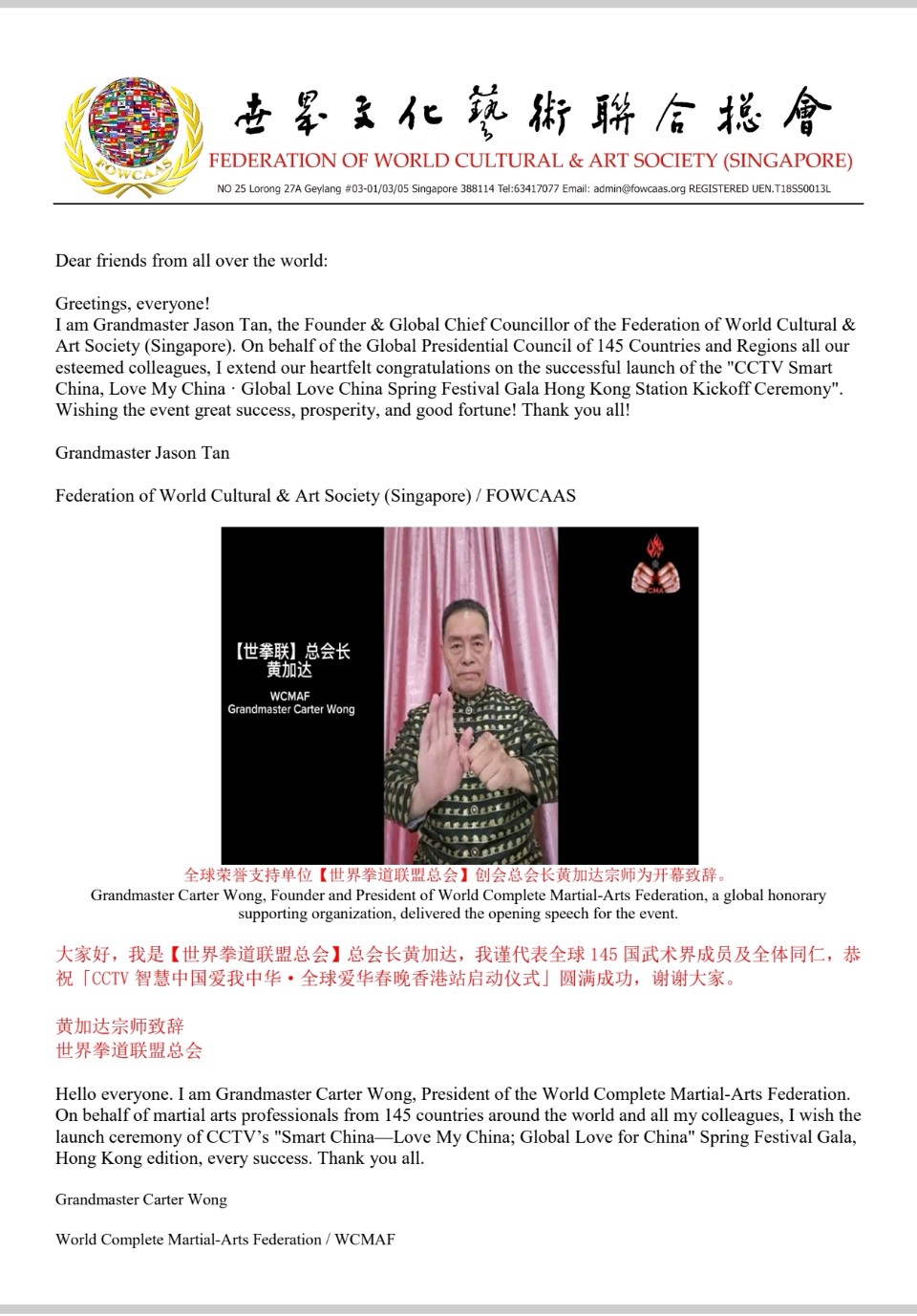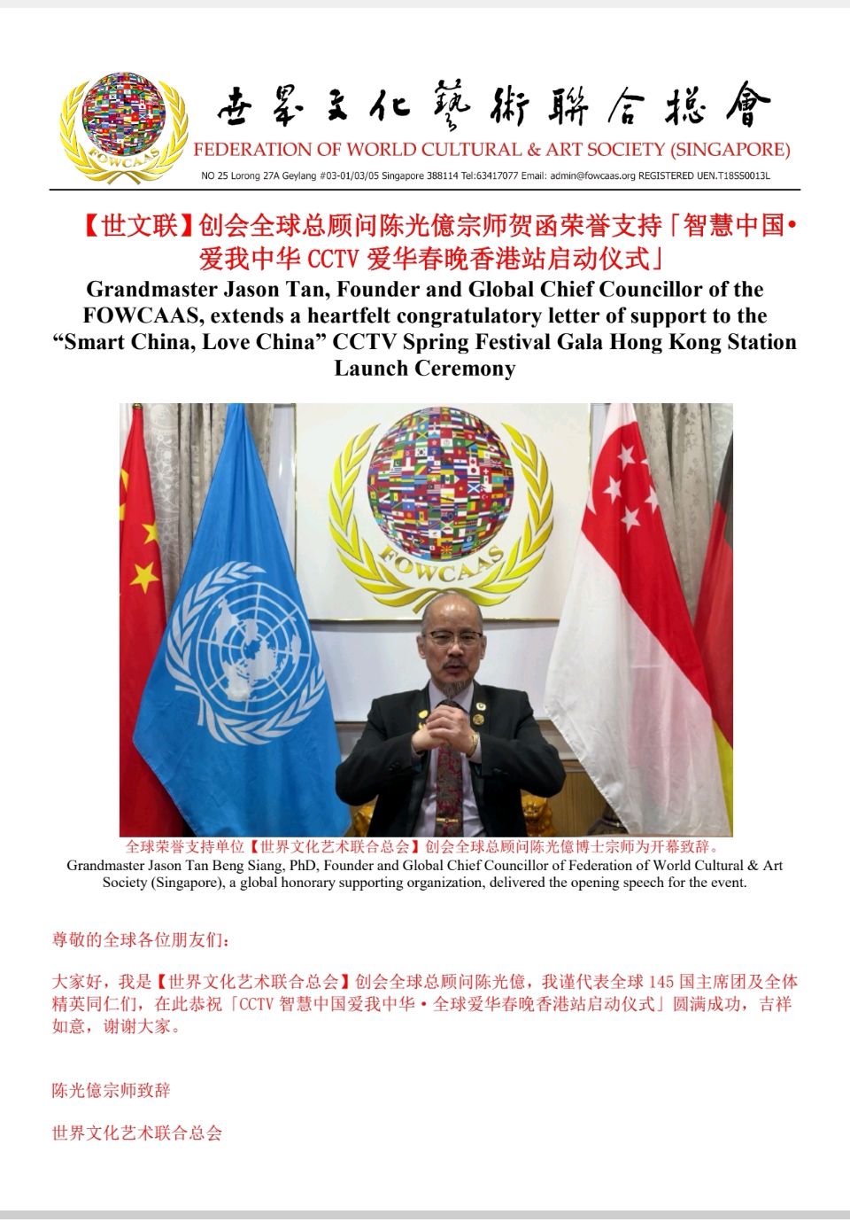 Grandmaster Jason Tan, Founder and Global Chief Councillor of the FOWCAAS, extends a heartfelt congratulatory letter of support to the “Smart China, Love China” CCTV Spring Festival Gala Hong Kong Station Launch Ceremony