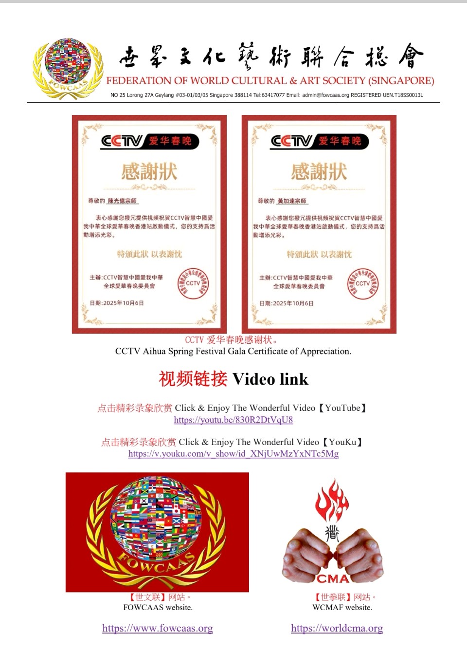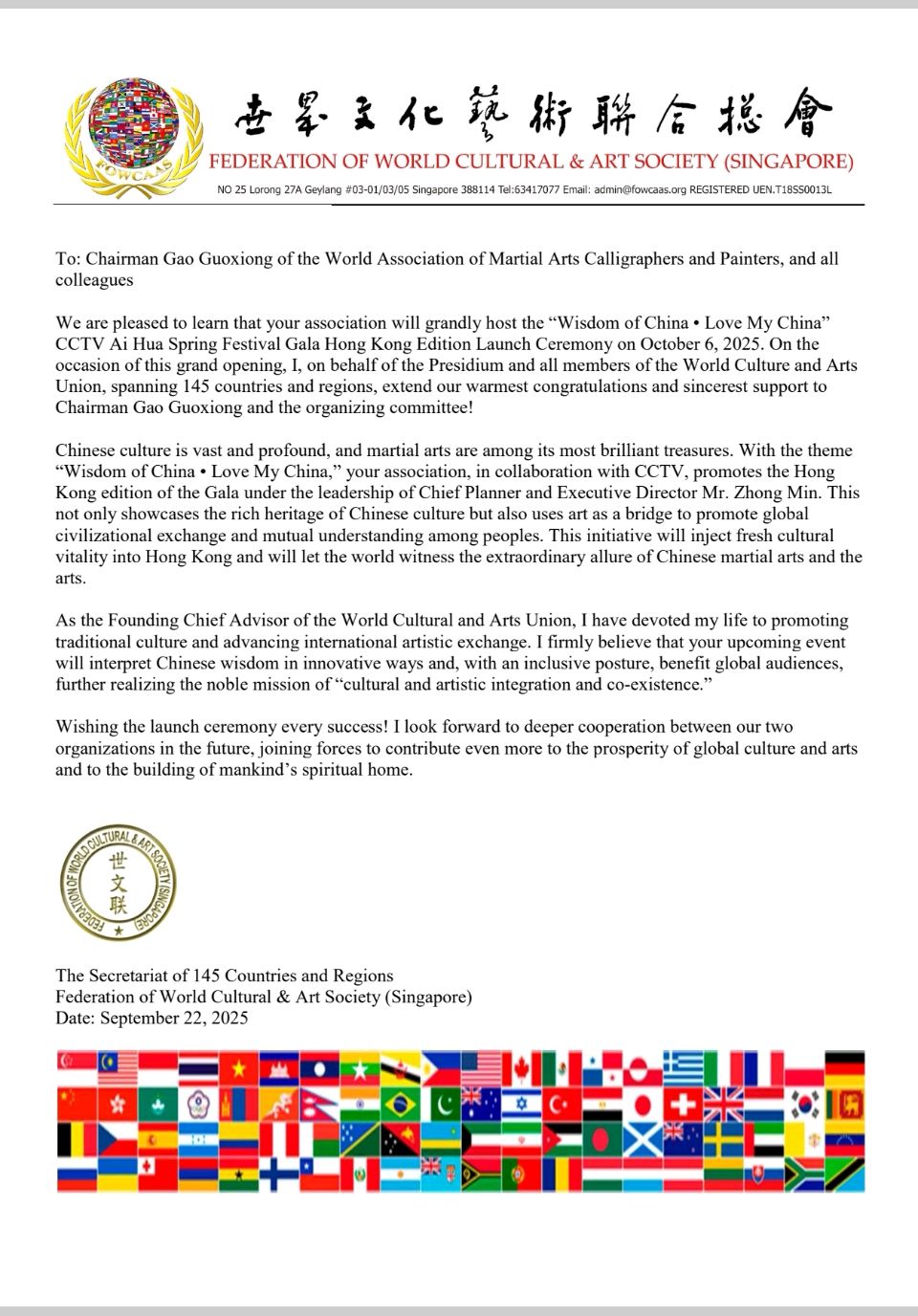 【世文联】创会全球总顾问陈光億宗师贺函荣誉支持「智慧中国•爱我中华CCTV爱华春晚香港站启动仪式」