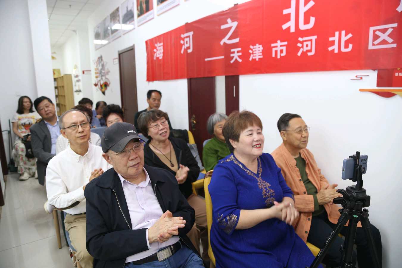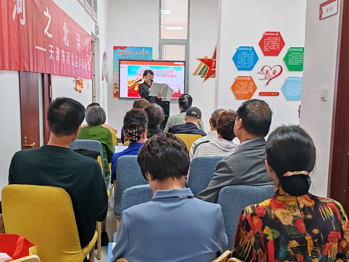 金秋送爽、丹桂飘香。9月27日,天津市河北区作家协会《海河之北》诗社举办迎国庆暨纪念抗日战争胜利80周年主题诗歌朗诵会。河北区作家协会名誉主席张秋铧应邀出席。作协主席邵衡宁发来贺词预祝成功。河北区鸿顺里街关爱退役军人协会会长盛茂林提供活动场所,给予大力支持。朗诵会由河北区作协常务副主席、《海河之北》诗社社长殷秀玲主持。此次活动由五子天地文艺创作社协办,23人参加。 “80年前中华儿女浴血奋战,如今天安门阅兵的震撼场景仍历历在目!”朗诵者深情演绎,将现场观众带回那段烽火岁月和当下的盛世繁华。14首精心编排的诗歌依次登场,每一首诗歌串连起来,呈现出一个个清晰的情景和情境,仿佛构成一幅跨越时空的爱国画卷,仿佛演奏一首震撼心灵的音乐乐章。