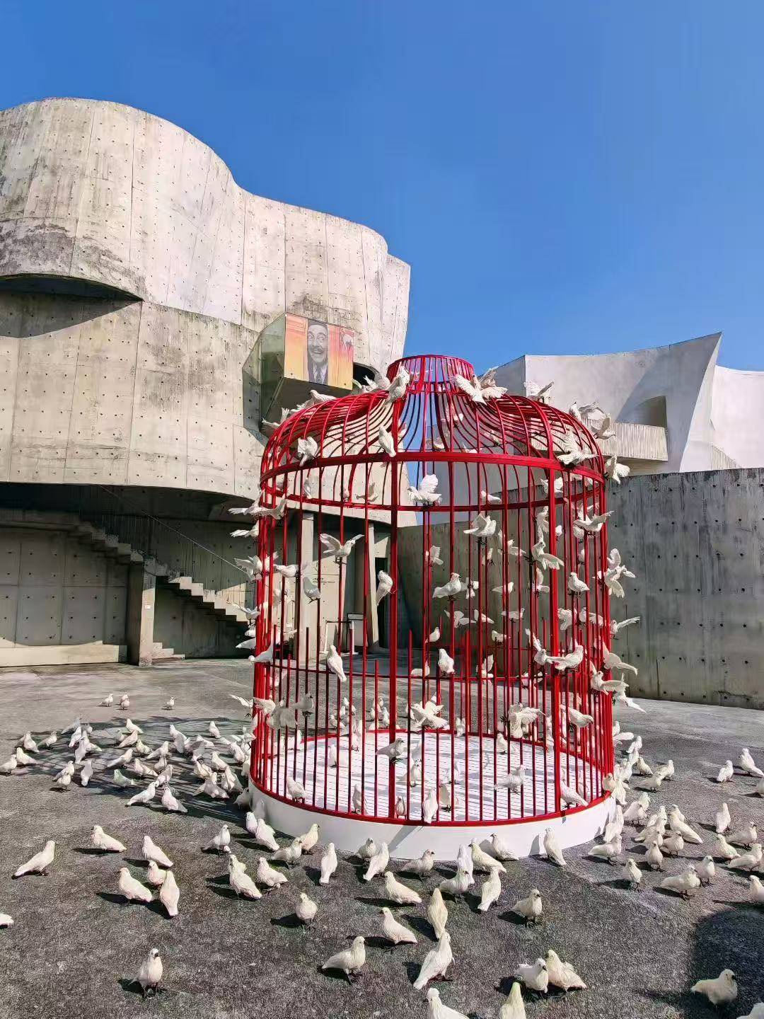 周艺文装置艺术作品《开放的鸟笼》,材料:不锈钢+仿真白鸽