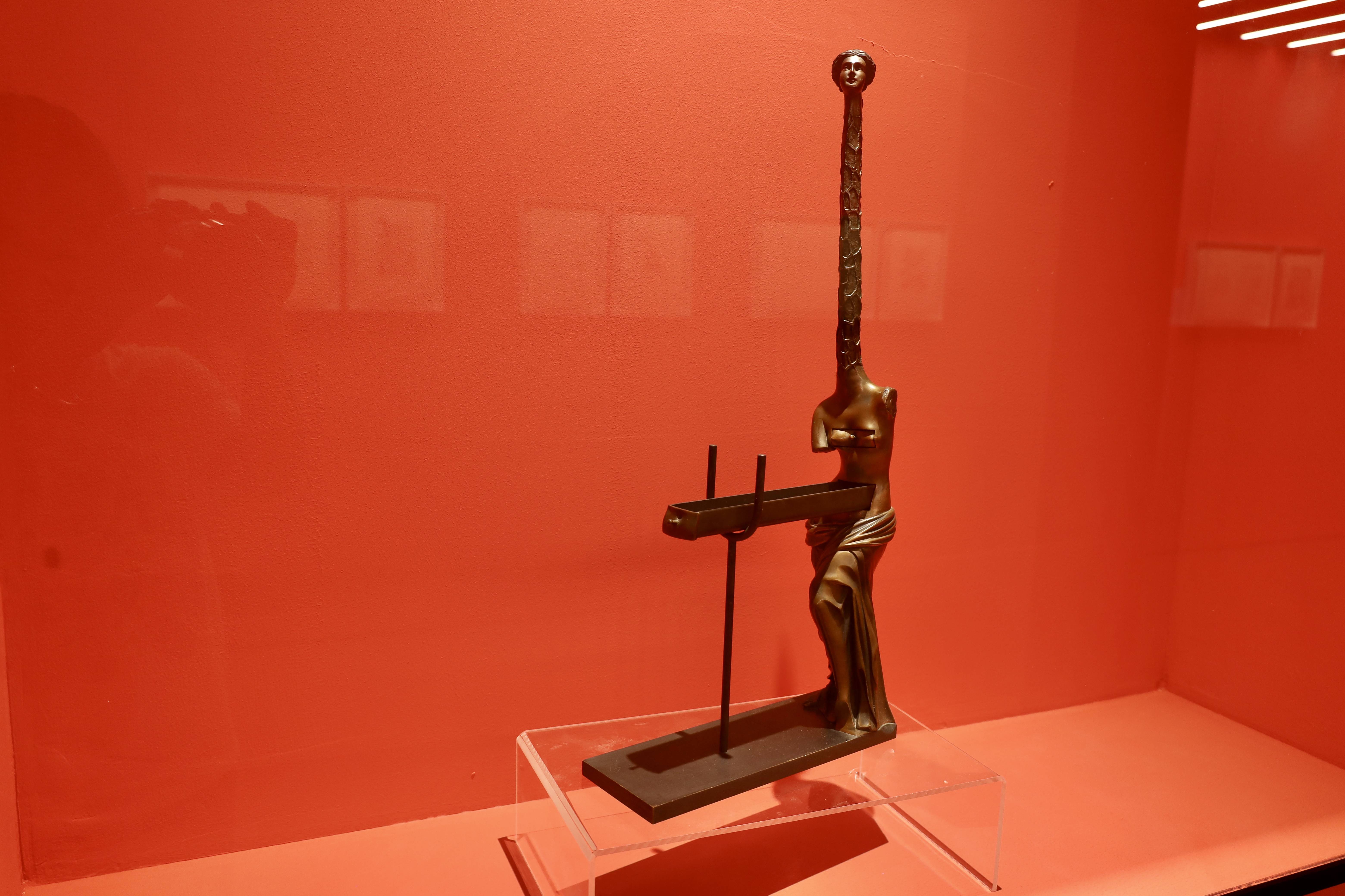 达利板块的青铜雕塑《长颈鹿维纳斯》堪称超现实符号典范:以古希腊维纳斯为原型,修长鹿颈与女性躯体融合,胸前抽屉元素呼应弗洛伊德理论,内部微型钟表、羽毛等细节强化“记忆与欲望”主题。