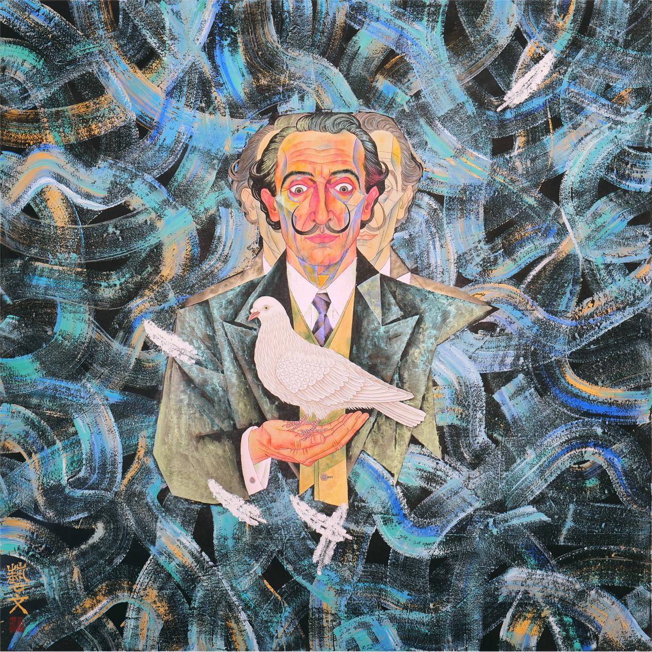 “新文艺复兴”国际当代艺术家周艺文与达利的“超现实主义”相遇,一场天才的对决,一场引发灵魂震颤的梦境。《达利意象》是周艺文“新文艺复兴”当代艺术运动的代表作之一。达利手托白鸽的瞬间被凝固定格,背景不规则粗线肌理,白鸽作为自由的象征,指引观者在严谨笔法与荒诞构图的张力间,探寻超越文化的当代艺术思潮。周艺文重构了历史与当代的语境,蓝色的曲线既是历史的轨迹,又是当代的走向,白色的羽毛与鸽子是周艺文灵魂的符号。画面上集中了当代艺术家与大师的呼吸,不能承受的生命之轻,必须承受的艺术之重。