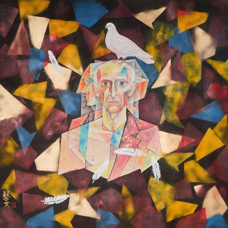 周艺文是近年来在欧美引起较大关注的国际著名当代艺术家,他提出“新文艺复兴”当代艺术运动。“欧洲文艺复兴”及其之后的诸多元素,在周艺文的创作里成为一种历史材料,被重新处理、叠加或变形,使他们获得了新的身份-新的启蒙角色。《毕加索意象》是他这一时期的代表作之一,周艺文与毕加索进行跨越时空的灵魂对话。几何切面之间,白鸽立于混沌的形体之上,羽片浸染着宣纸温润的暖色,那些被拆解的轮廓在赭石与琥珀的调和中重新获得平衡,照见破碎与完整的辩证。“新文艺复兴”当代艺术家与“立体主义”大师巅峰对决,在一个时空里重构了周艺文与毕加索的空间、色彩与线的关系。