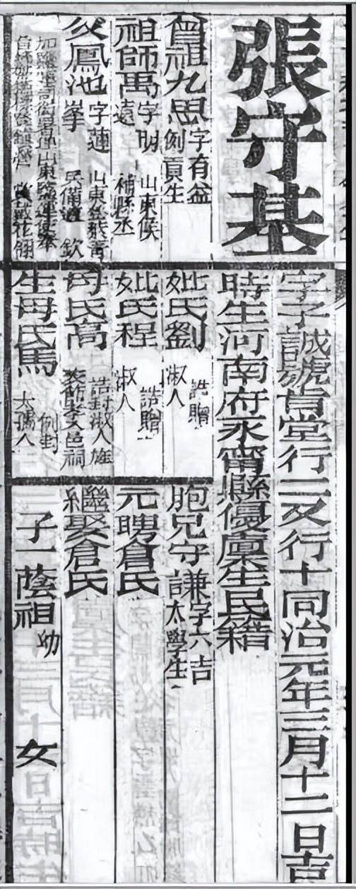 张守基,字子诚,幼名东林,生于同治元年三月十二日。光绪十一年乙酉科拔贡,光绪辛卯科(光绪十七年,公元1891年)举人,戊戌科大挑一等,分发广东知县。清光绪三十三年,永宁县成立劝学所,张守基首任劝学总董。民国元年任河南省临时省议事会会员。民国六年协修《洛宁县志》八卷。《洛宁张君(张守基)墓志铭》,河南固始秦树声撰书,河南中牟仓永龄撰盖。该墓志铭原拓尚存于世。