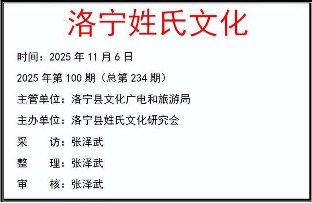 作者简介:张泽武,洛宁县陈吴乡新寨村人,2003年,发起并成功组织成立了洛宁县姓氏文化研究会,担任常务副会长兼秘书长一职,2006年参与组织筹备成立洛阳市姓氏文化研究会,任副秘书长。2017年被推举为洛宁县姓氏文化研究会会长。2024年8月再次当选为洛宁县姓氏文化研究会会长。