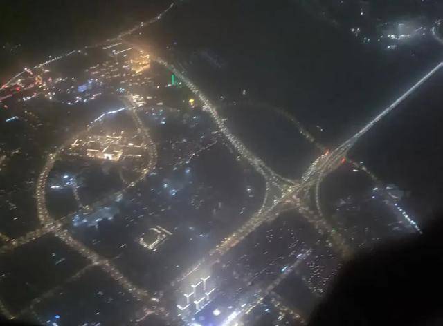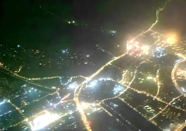 后来因四周漆黑,我便将视线转移到手机上,边看时间边记录飞机航行情况。幸得邻座宜阳县城的小伙提醒,我才看到机窗外地面灯火通明,公路上的车辆宛如一个个红灯笼挂在夜空,参差不齐的大楼灯光五彩斑斓,犹如仙女洒落的碎星星,仿佛踏入天上仙宫,堪称地上仙境。