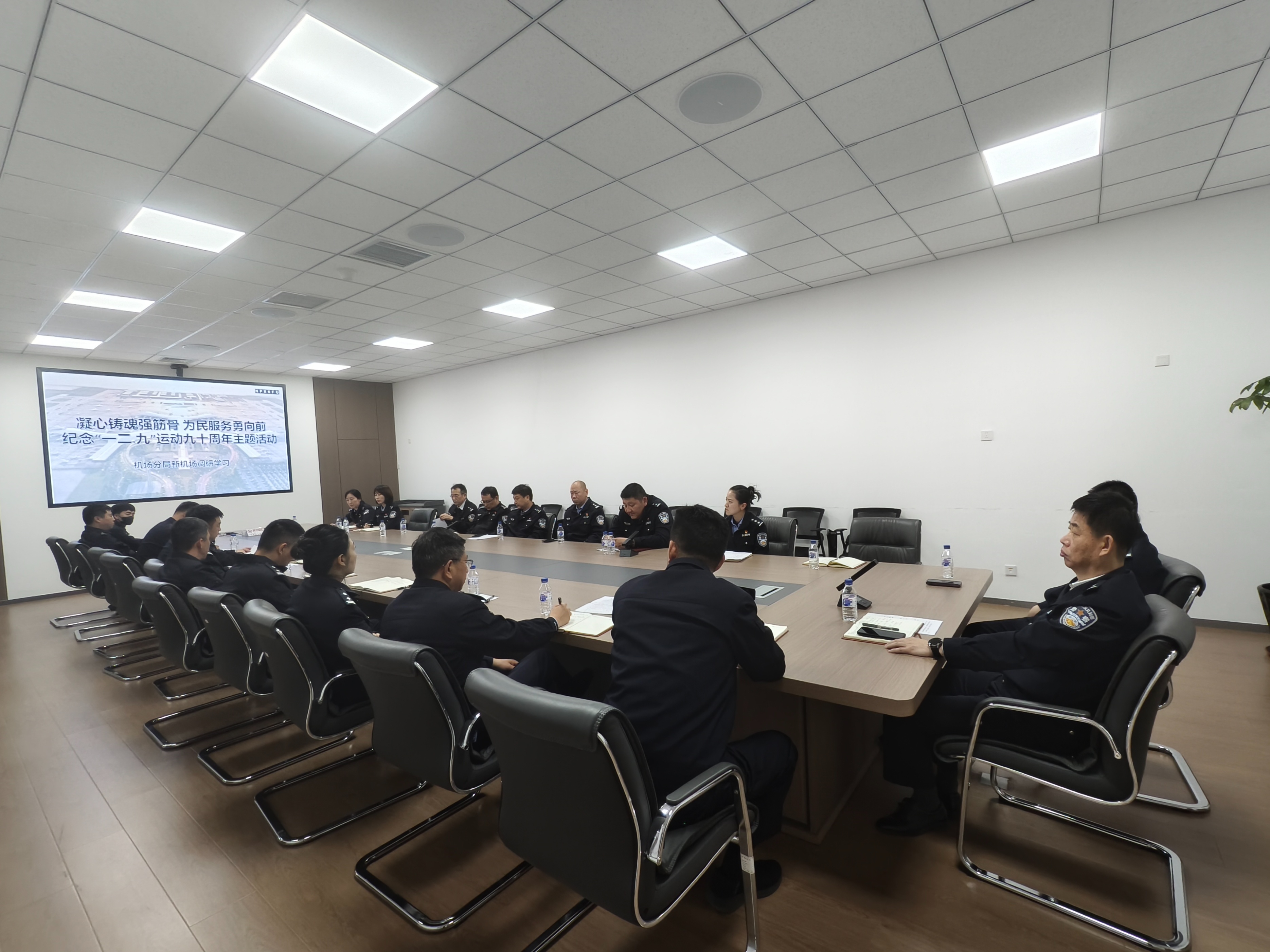 实地参观后,大家集中观看“一二九”运动主题纪录片,重温革命历史,凝聚爱国担当。座谈环节,大家立足岗位职能,结合调研所见与新机场安防实际以及安防保障衔接深入交流,明晰工作思路。活动最后,机场分局相关负责人也结合新机场安防保障提出具体工作要求:一是建立常态化对接机制,二是优化重点区域安防布防,三是推进专项能力提升行动,四是健全风险隐患闭环管理,推动全体民警全力护航新机场建设。