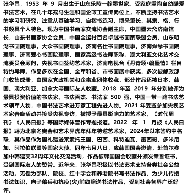 笔耕不辍守初心,墨润流年铸芳华。张华昌老师的书法艺术,没有惊天动地的壮举,没有华丽张扬的修饰,唯有日复一日的坚守与付出,唯有对书法艺术的赤诚与热爱。他从楷书起步,博采众长,兼修隶、行二体,在笔墨流转间,彰显出扎实的笔墨功底与鲜明的个人特色;在传承创新中,传递出对中华传统文化的敬畏与担当。相信在未来的日子里,张华昌老师将继续以笔墨为帆,以初心为舵,在书法艺术的海洋中不断探索、不断前行,创作出更多优秀的书法作品,让传统书法艺术在新时代焕发出更加蓬勃的生命力,让中华优秀传统文化在笔墨流转中代代相传、生生不息。