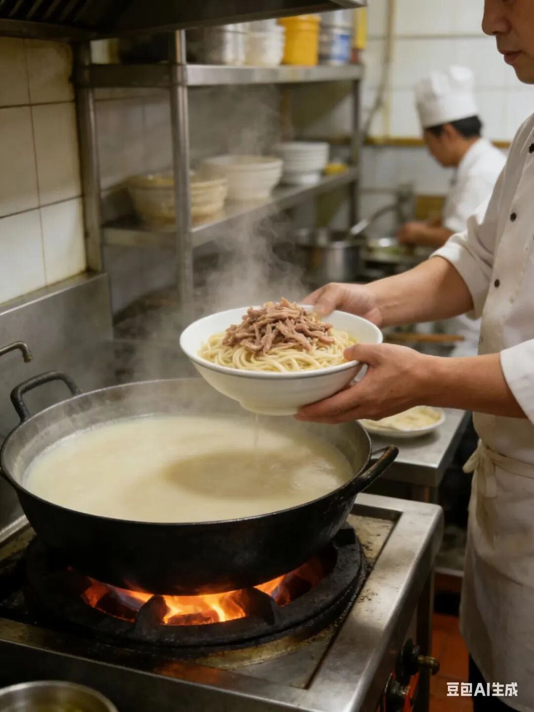 煮面也有讲究:干碱面入沸水,煮至七八分熟便捞起,冲入滚烫高汤,借汤的热力继续焖熟。面既筋道弹牙,又能吸饱高汤鲜味,一口下去,丝滑入喉,满口留香。