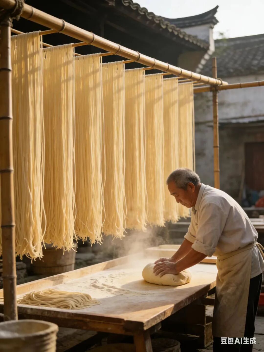 揉好的面,拉丝、上架、自然晾晒,脱去多余水分,不粘不坨。这样的面下锅,清爽筋道,久煮不烂、不稠不软,这正是平江面区别于别处的灵魂所在。