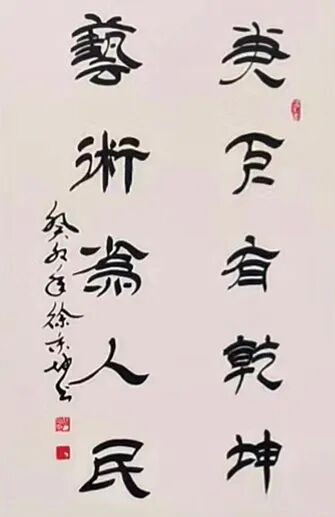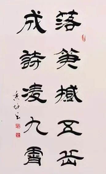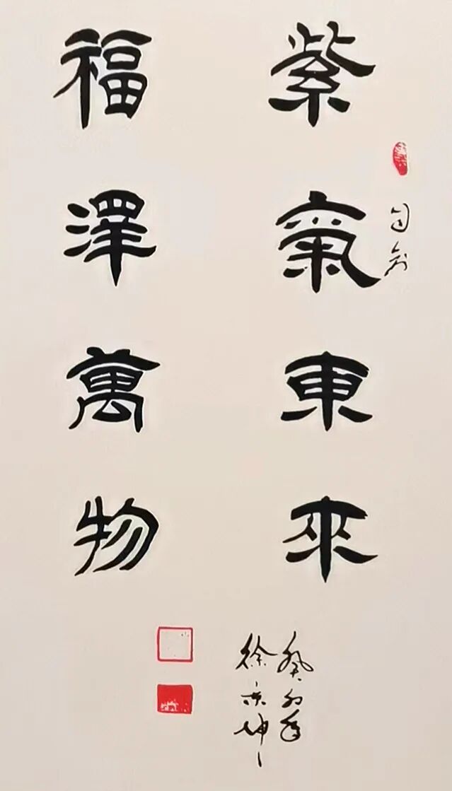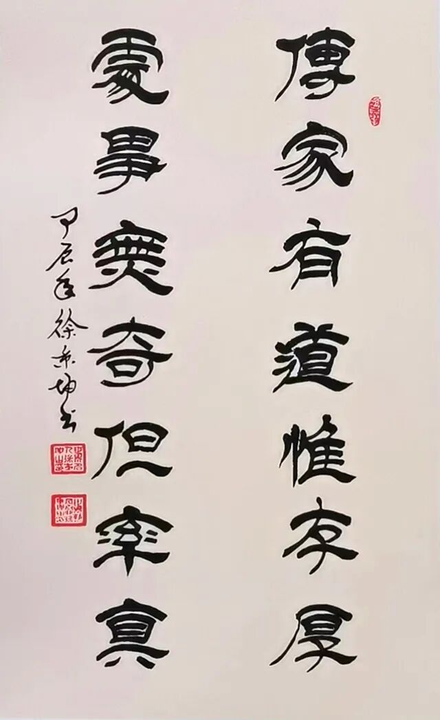 徐秉坤先生篆书直追三代秦汉,于古穆中见灵动,深研甲骨、钟鼎、石鼓诸体,得古人结字精微而重塑风神,使千年古文字在其腕下焕发出新的生命力。先生之隶书,堪称当代一绝。其融《张迁》之雄强、《礼器》之劲健、《乙瑛》之温润、《石门》之开张于一炉,结体宽博恢弘,用笔沉厚老辣。蚕头蓄势如岳峙渊渟,雁尾舒展若云卷云舒,更将隶书静态与行草流动巧妙相合,满幅笔墨精严而气脉贯通,于端庄中见灵动,于法度中显性灵,直抵“从心所欲而不逾矩”之化境。细观其隶书作品,点画之间既有金石之质,又具书卷之气,可谓兼得雄秀二美。