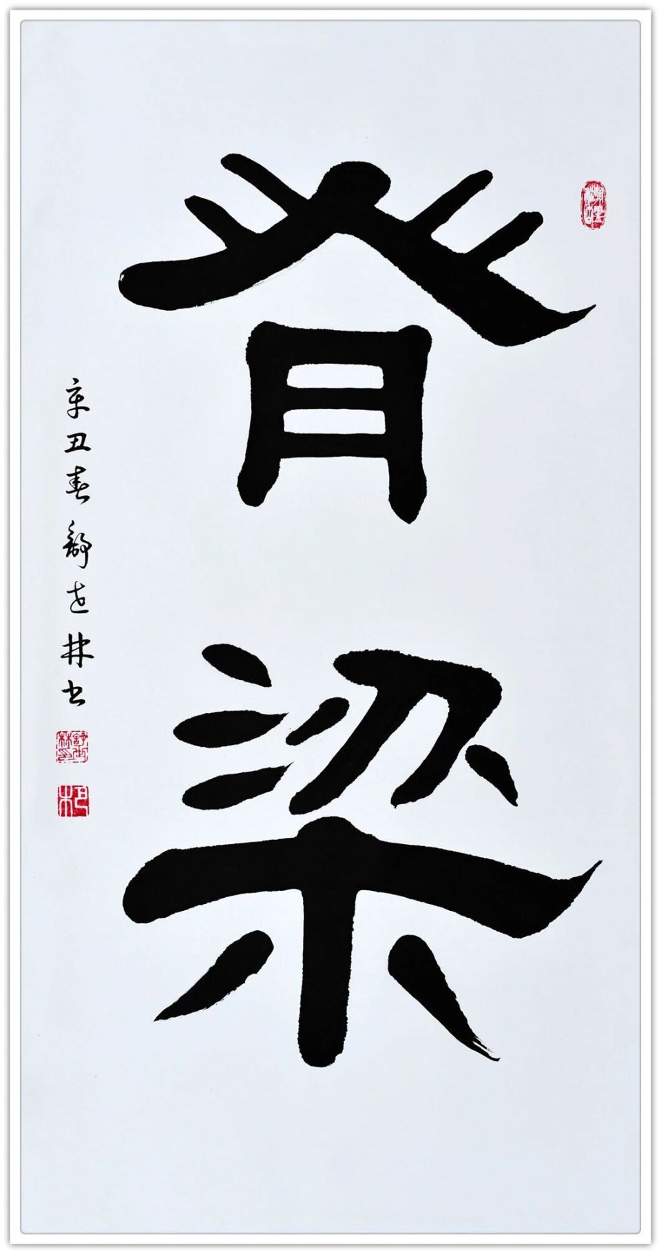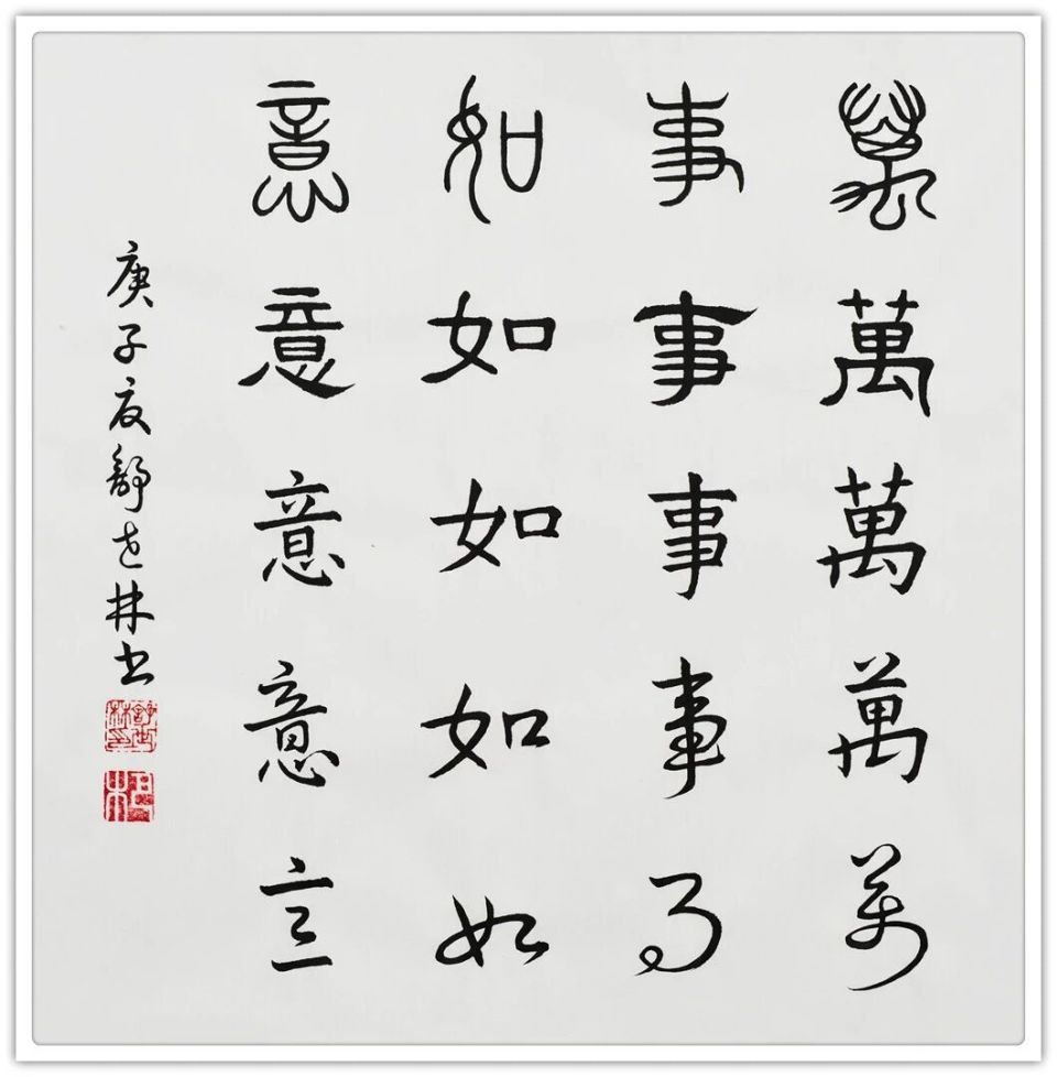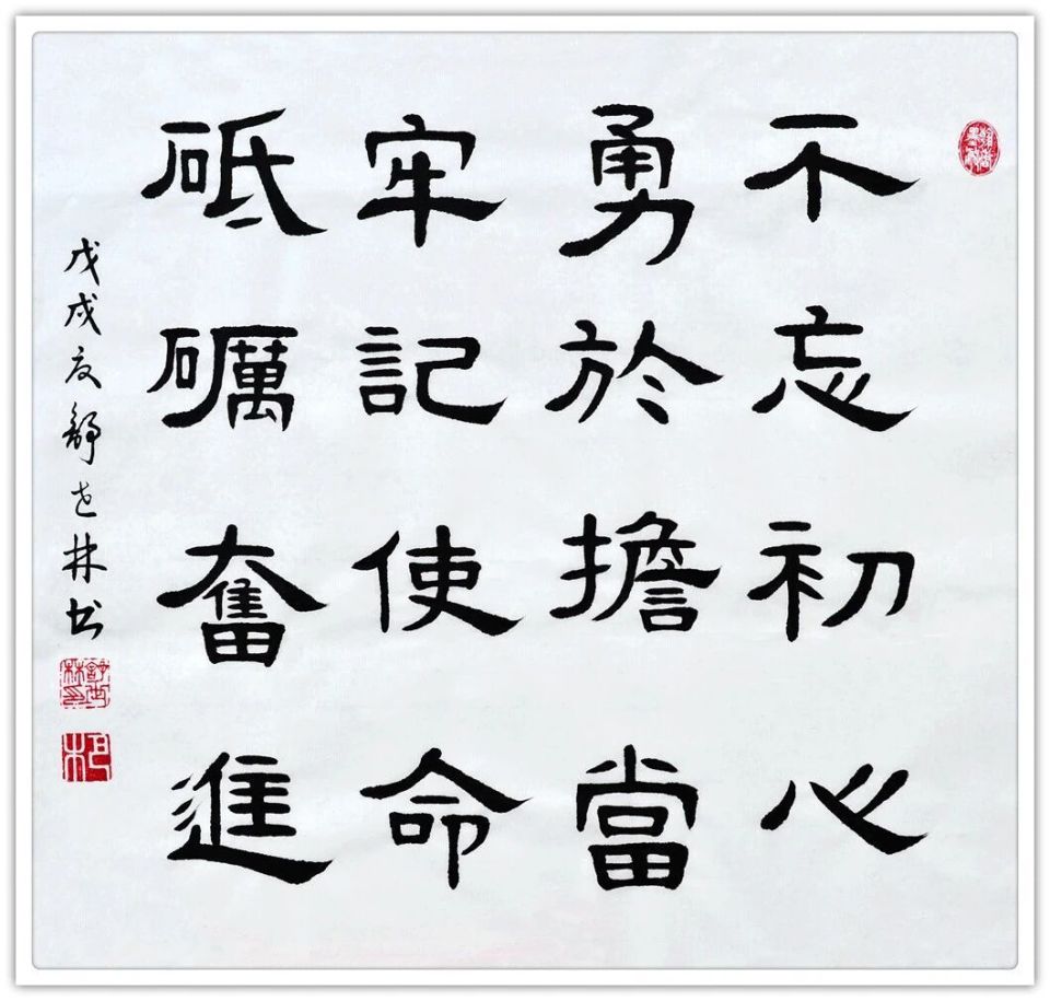 四十多年来,楷行隶篆草五体皆学,在继承传统的基础上努力创新,追求正大气象,主攻隶书与榜书,努力探寻禅意书法。隶书蝇头、小、中、大、榜书各种规格皆写,突出“蚕头燕尾、一波三折”,风格秀丽、端庄、典雅。禅意书法融飞白于线条,追求象形、会意特点,回归文字起源。