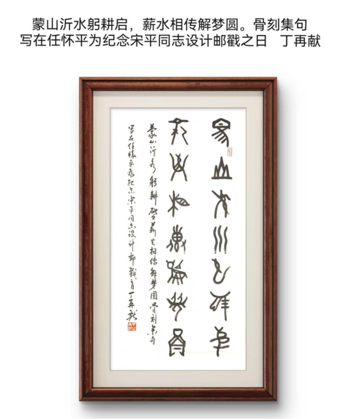 这是著名邮品设计艺术家任怀平先生在方寸邮戳之间,突出宋平同志寄寓家国情怀;于寥寥联语之中,见历史之回响。著名文化学者、资深文旅专家丁再献先生接到任怀平先生邀请为纪念宋平同志家乡莒县而作的邮戳集东夷骨刻文字配联。丁再献先生是正宗沂蒙山人,便自然有了这副对联:“蒙山沂水躬耕启,薪火相传解梦图”,不仅是对一位革命前辈的致敬,更以精炼笔墨,将地域、历史与精神传承熔铸一体。此联如一枚文化印章,盖下了齐鲁大地的红色记忆,也叩响了新时代的使命征程。任怀平先生同时为济南设计了一方宋平纪念邮戳。