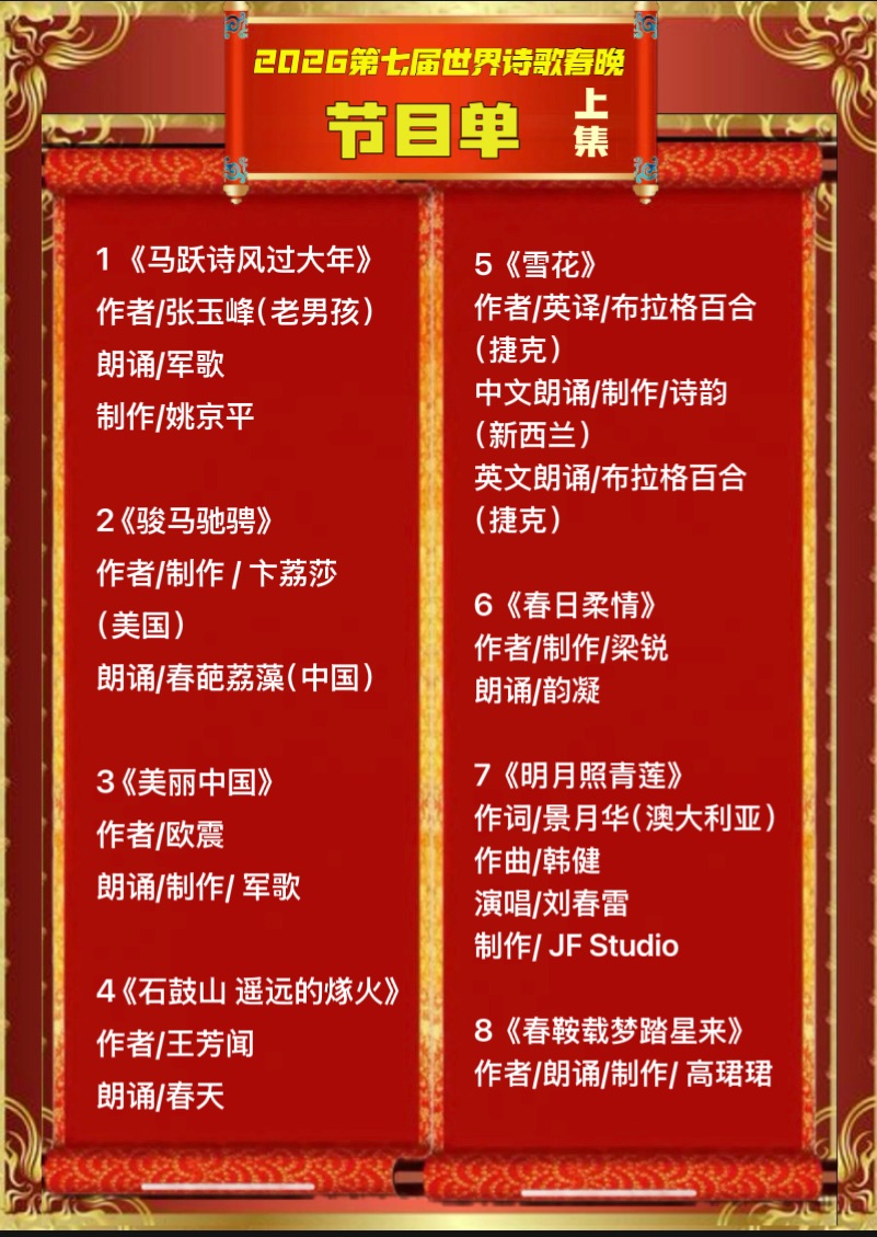 🐎2026第七届世界诗歌春晚既汉马金鞍映诗澜晚会(大全集)总策划:老男孩(张玉峰)🏆总导演/总制片:卞荔莎(美国)㊗️世界诗歌联合总会🌏