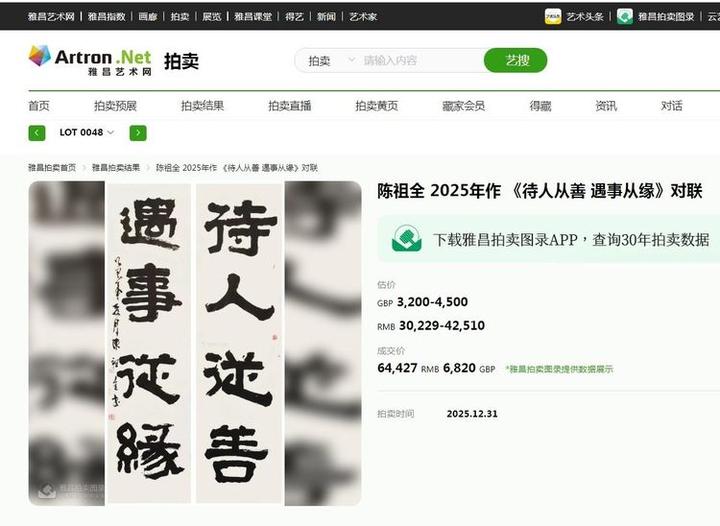 陈祖全书法作品《待人从善 遇事从缘》对联以6.4万元成交