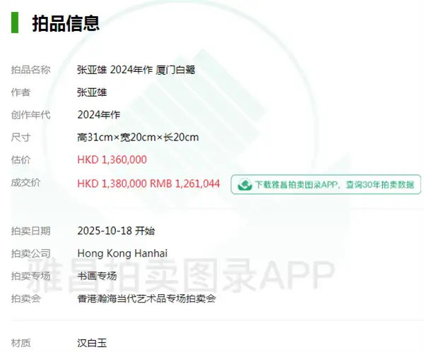 张亚雄雕刻《厦门白鹭》作品在香港瀚海国际拍卖会敲定138万港元成交