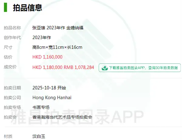 张亚雄雕刻《金蟾纳福》作品在香港瀚海国际拍卖会敲定118万港元成交