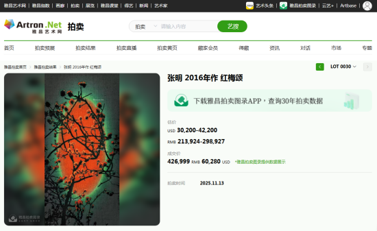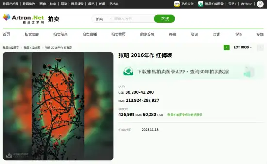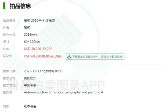 著名画家张明作品《红梅颂》落锤成交!