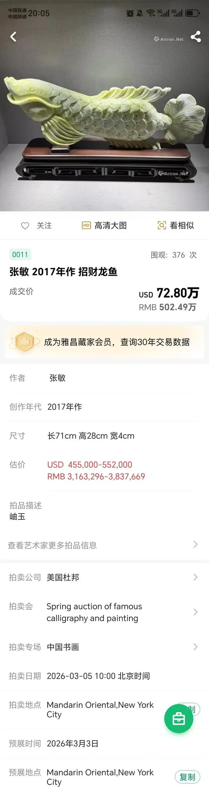 张敏《招财龙鱼》502.49万美国杜邦拍卖公司落锤成交