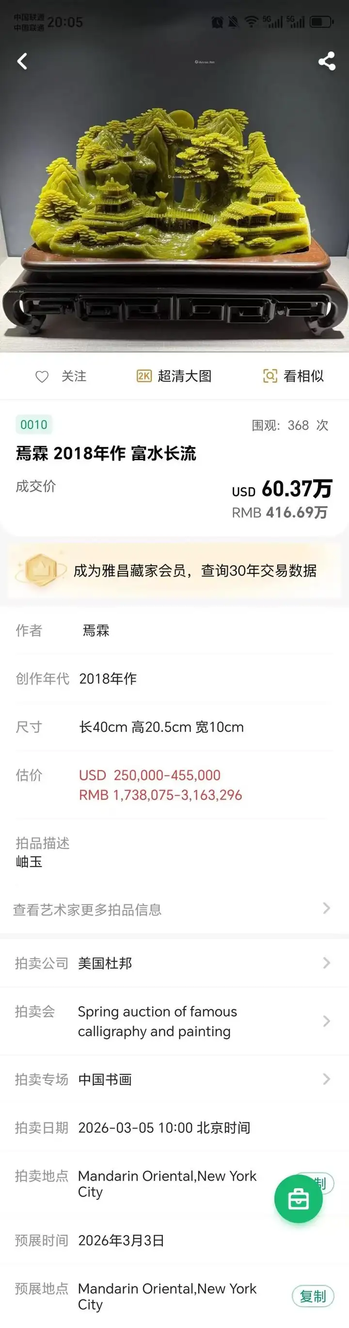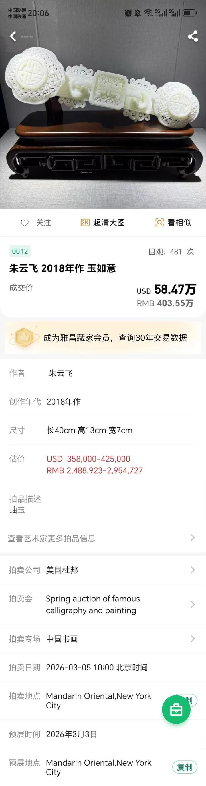 朱云飞《玉如意》403.55万元美国杜邦拍卖公司落锤成交
