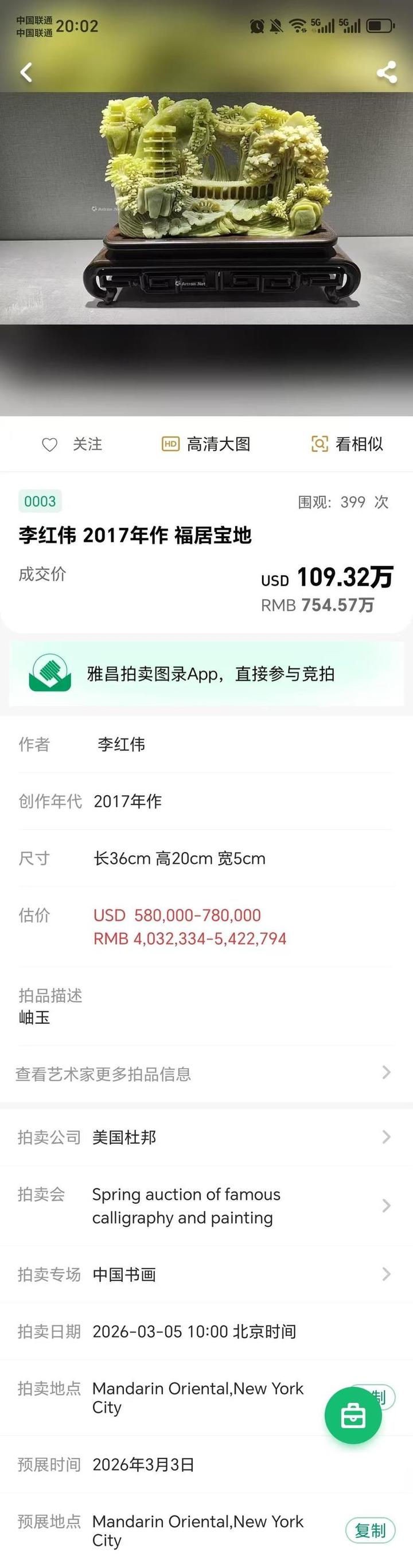 李红伟《福居宝地》754.57万美国杜邦拍卖公司落锤成交
