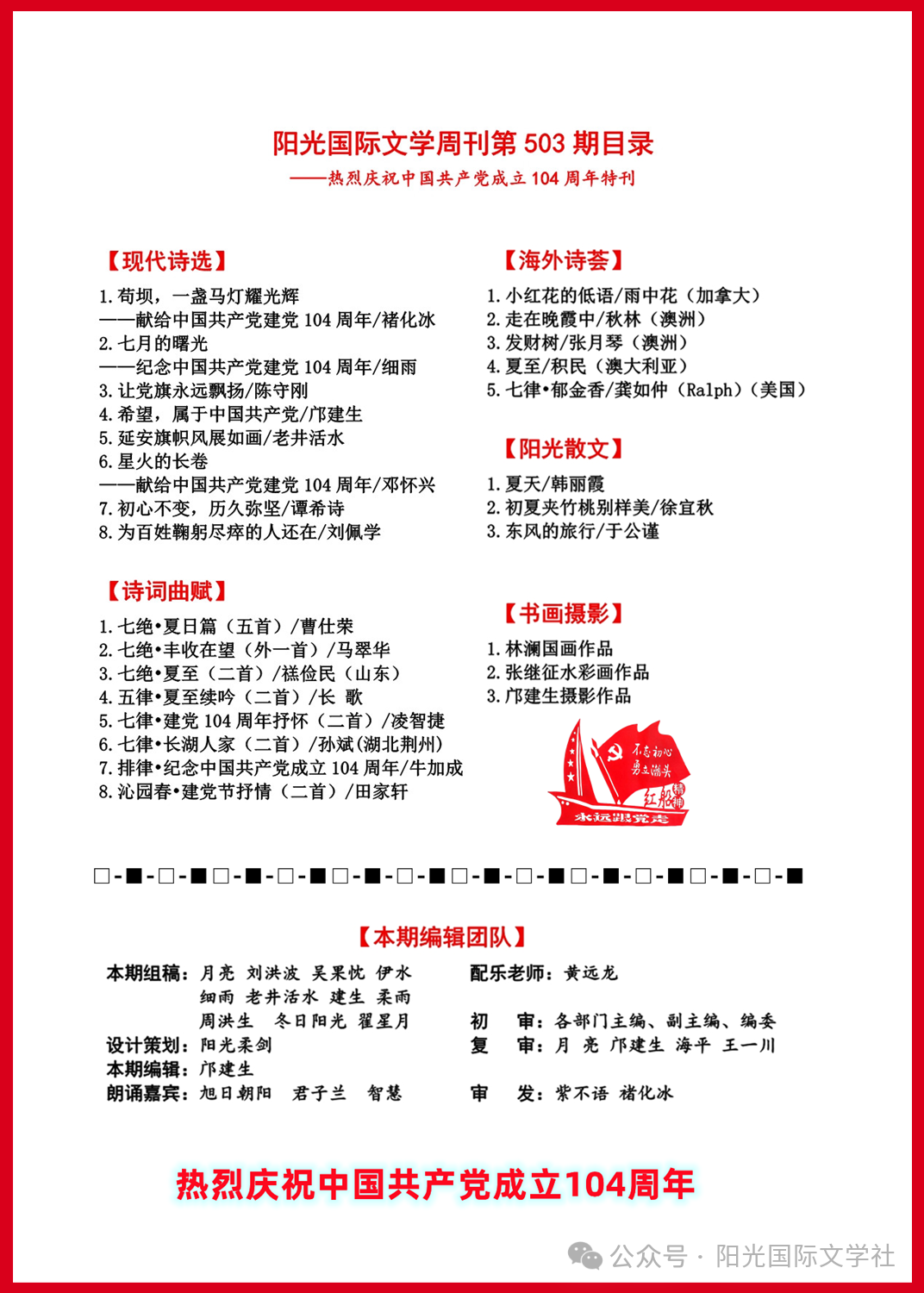 【震撼发布】 阳光国际文学周刊第503期·建党104周年特刊——以文学星火点燃时代荣光!