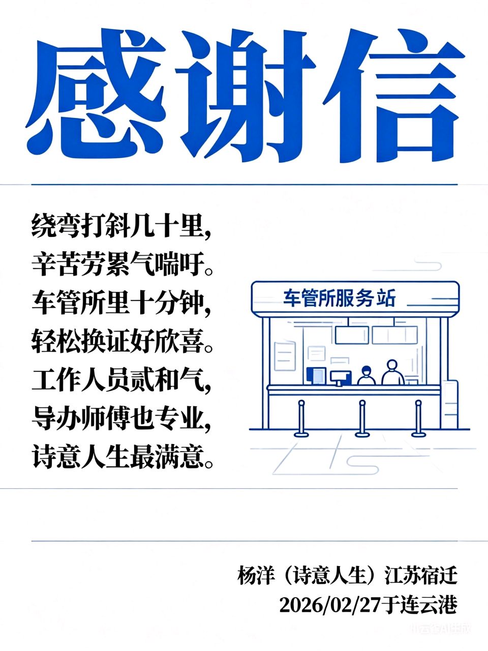 【荣耀中国】文学社*感谢连云港市车管所工作人员作者/杨洋(诗意人生)江苏宿迁