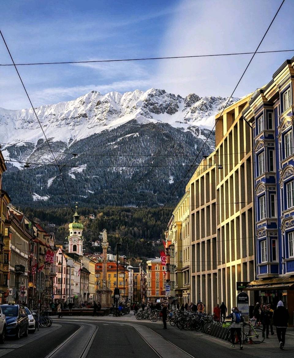 五律·因斯布鲁克文/梅湾赏雪雪岭抱皇州,金檐照古楼。河声穿市井,山色入春秋。曾记奥徽耀,长怀帝业遒。何须寻阆苑
