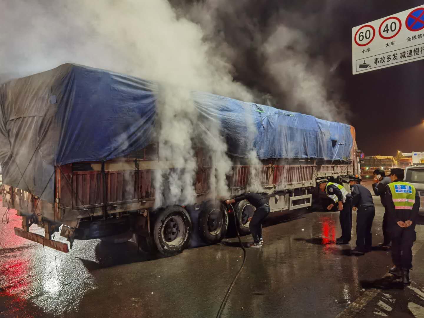 河南新安:大货车路上自燃,危急时刻民警奋勇救火