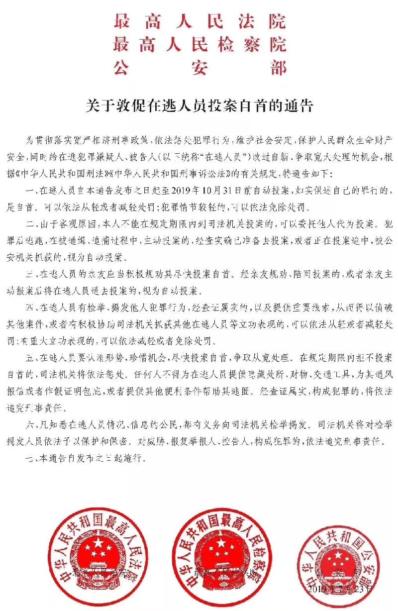 关于敦促在逃人员投案自首的通告
