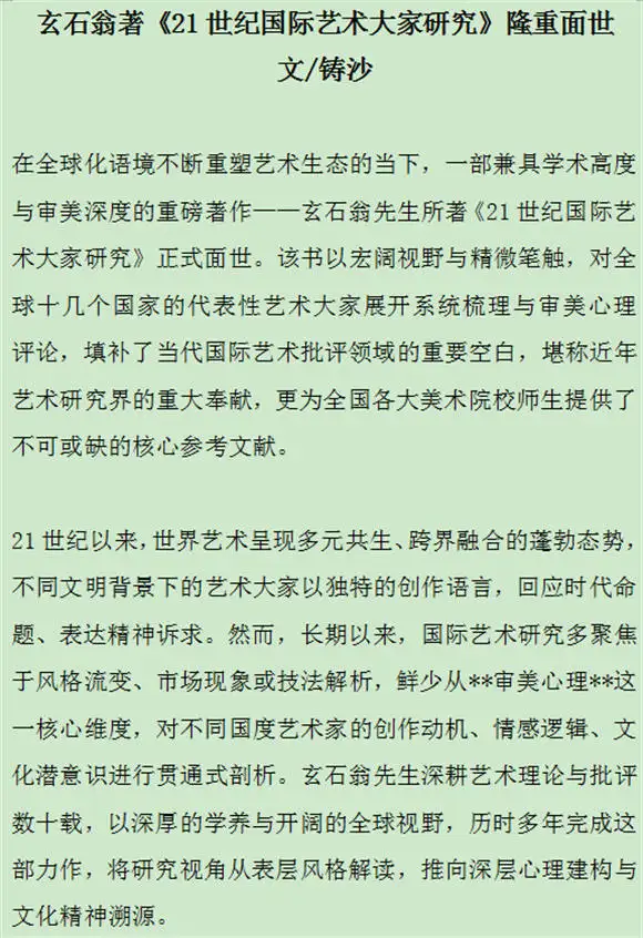 玄石翁巨著<21世纪国际艺术大家研究>隆重问世