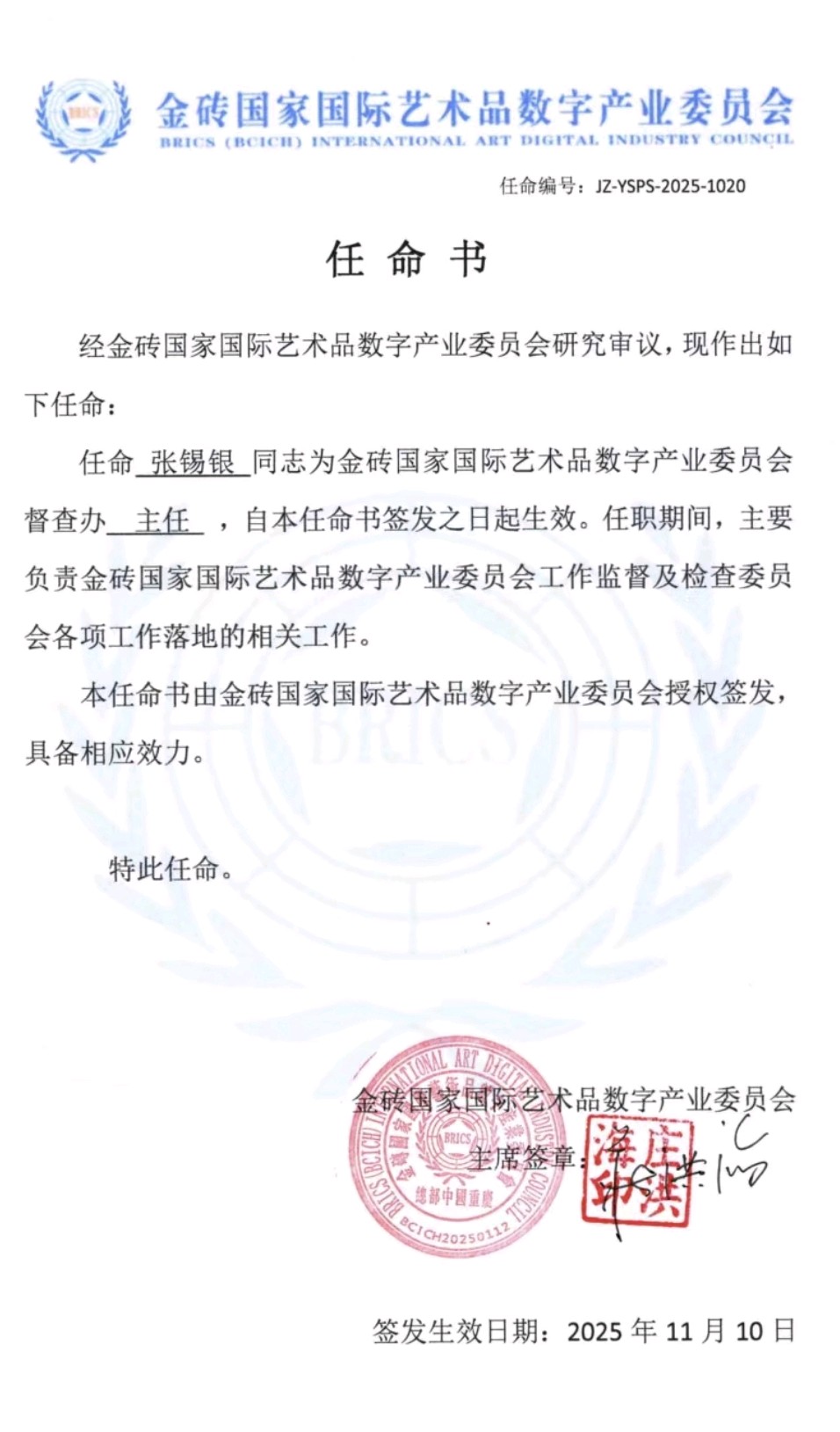 任命张锡银同志为金砖国家国际艺术品数字产业委员会督查办主任丨京港澳台世界头条发布