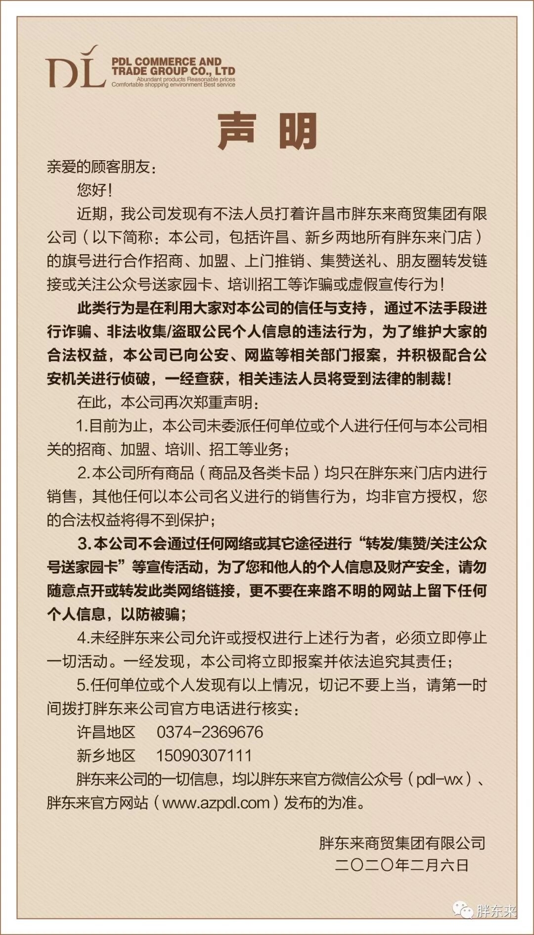 胖东来不会通过任何网络或其它途径进行“转发/集赞/关注公众号送家园卡”等宣传活动,为了您和他人的个人信息及财产安全,请勿随意点开或转发此类网络链接,更不要在来路不明的网站上留下任何个人信息,以防被骗!