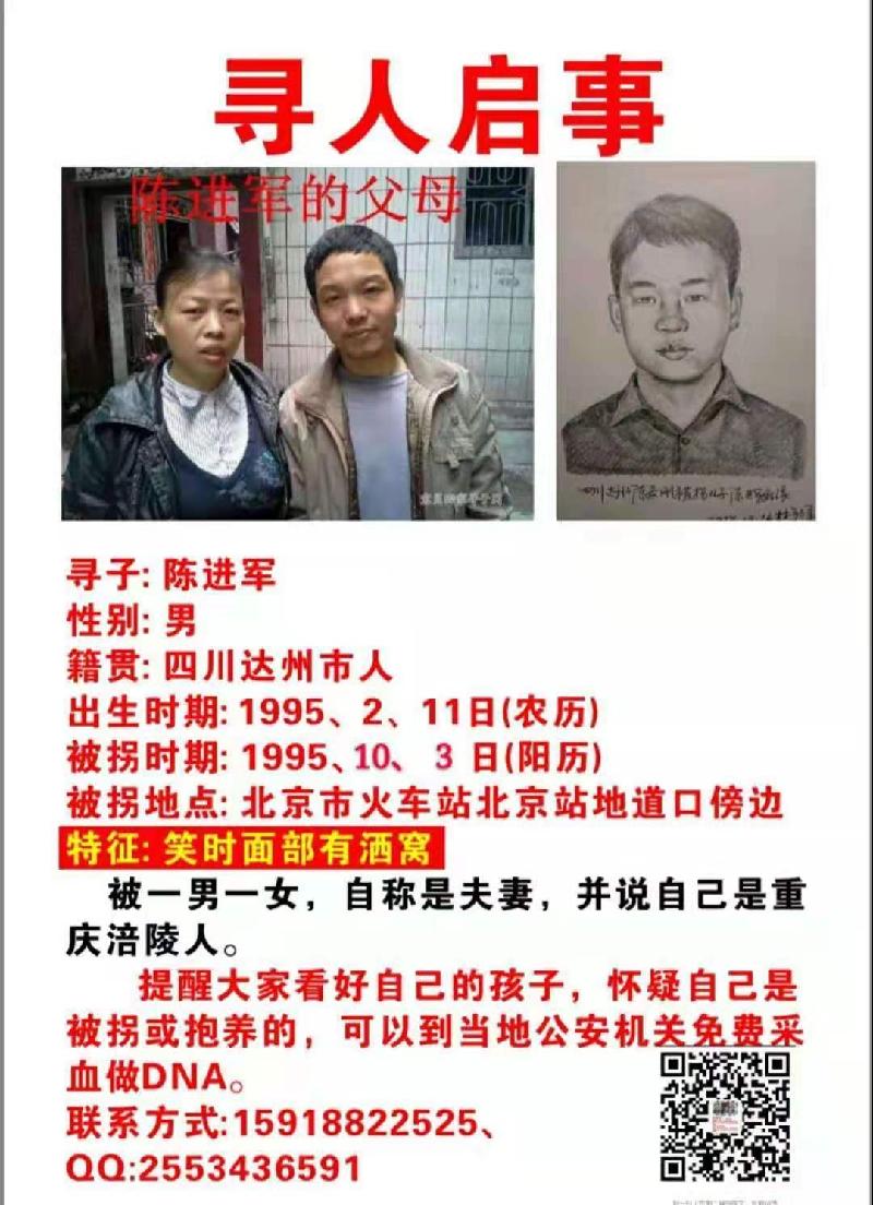 陈进军,男,1995年3月11日出生,1995年10月3日在北京火车站失踪。被拐时,头戴虎纹布料帽子,身穿编织的猪肝色毛衣,脚穿小毛线编织的鞋,当时右边屁股上有被妈妈指甲划伤的痕迹。