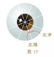 在眼球底部的近中心处为腰区。腰区出现血丝时,表示腰有病。此图表示腰部外伤引起了肾脏受伤,则腰区血丝会在中途与肾区血丝相连,腰部诊断比较容易(见图17)。