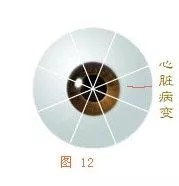 在眼球的左侧眼角上约3毫米处出现的血丝为心脏区,如果血丝短而细,此人心火旺,或有心律迅速。若血丝长而粗,此人心脏已发生了器质性的病变。如颜色鲜红,病在最近;呈深棕色,症状缓解,暂时处于稳定状态。观察患者左眼上心脏区有血丝,而右眼的心脏区却没有时,也必须认定心脏有病,只是不太重。若左右眼同一部位出现相同状血丝,则说明病情较严重了。对其他区域的血丝观察,也必须与此相同。即看完左眼,不要忘了再看右眼(见图12)。