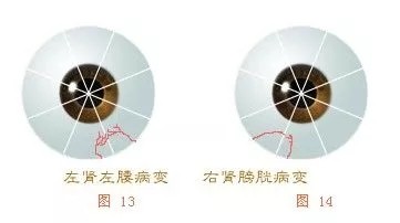 在眼球的左右眼角下各约3毫米处为左右肾区,因肾在人体内分左右各一而分布的。当左侧肾区有一血丝时,右肾有病。在看左眼时,在左侧有一粗而长的血丝,而在右眼的左侧却没有血丝;相反在右眼的右侧肾区却有一粗而长的血丝时,应认定患者左右肾都有病,但不算太重。若左右眼的左右肾区同时都有血丝时,患者两肾均病的很重;若左眼左右肾区无血丝时,而右眼左侧肾区有血丝,患者右肾无病,左肾有病也不太重。当女同志肾区出现一粗而长血丝,同时这一血丝下方连接着许多小血丝,这些小血丝又没构成网络状时,表示患者除了肾功能损伤外,同时伴有卵巢及输卵管有病。男性则伴有前列腺肥大症。(见图13、14)