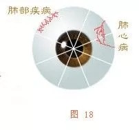肺区处在颈椎区与心脏之间的这一区域内。如在肺区内出现大量小血丝,且构成一网络状时,表示患者肺部疾病广泛,这是肺结核、肺气肿患者的特征。如果肺区有一血丝向下偏入心脏区的血丝上,有两根较粗黑线(如图18所示),即患者由于肺部的严重炎症,而使心脏受到损伤,如肺源性心脏病。在肺区出现单一血丝,就要考虑胸是否有病,如胸膜炎等。但也不能排除单一肺病,如肺结核等。