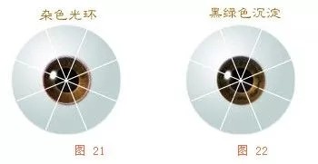 (4)在瞳孔至黑眼球边缘的二分之一处,有一黑色沉淀物组成的环,此人胃病已较严重,胃天天都在疼,但胃脉未绝,还可治疗。若黑色沉淀物变成绿色沉淀物,或黑绿混合,表示胃病已有癌变,胃脉已绝。已很难治疗了(见图19、20、21、22)。