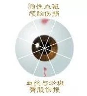 在眼球的最上方正中为脑部区。若在这一区域上出现一片半圆形的隐性血斑,且呈紫色时,则说明患者脑部受过撞击,或者曾有脑震荡(隐性血斑指的是眼球内的内出血状)见图(2)。