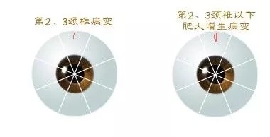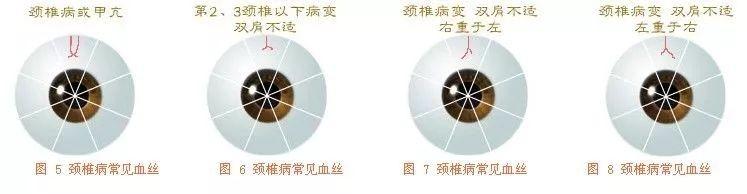 在眼球最上方正中部位处出现血丝,且呈垂直向下走向时,说明颈椎的2、3节有病变。若同时有脑部区的隐性血斑时,患者颈椎损伤是由外伤引起的;如果在眼球上方正中偏左或偏右一毫米左右的地方出现血丝,患者颈椎病偏下与血丝同方向处有肥大增生,也就是说2、3节以下有病,有大增生。若这条血丝的终点向同方向眼角处偏斜,或者除了颈椎病外,并伴有肩部的不适。如果这一血丝的颜色呈深色,而且长到达眼珠的外缘时,则说明患者颈椎病较严重。若左右侧颈椎血丝在中间相连,则颈椎疾病更加严重。如梗椎、甲亢等。见图(3、4、5、6、7、8)