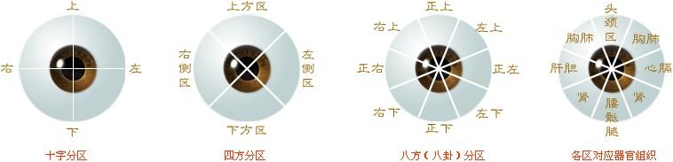 也就是把患者眼皮上下用手指撑开,让患者上下左右各看一次,这样患者眼中血丝的分布和位置,就能全部看清楚。我们以左眼为例进行分析,用三种分区方法列例,主要以八方分区法进行解析。