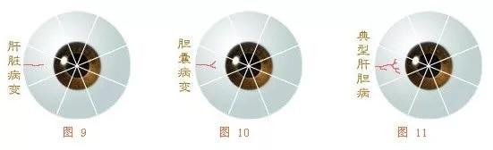 若这一血丝周围出现一片网络状的细血丝时,往往是外伤引起的这一区域的不适。患者眼球右侧上方三毫米处出现此种血丝,胆必有病,如胆囊炎、胆结石等。分叉越大,血丝越粗,病越重,反之则轻。见图(9、10、11)