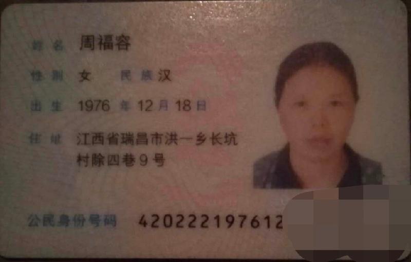 周福容,曾用名周红艳,女,1976年12月18日出生,操湖北省阳新口音,江西省九江市瑞昌市洪一乡长坑村四组人。