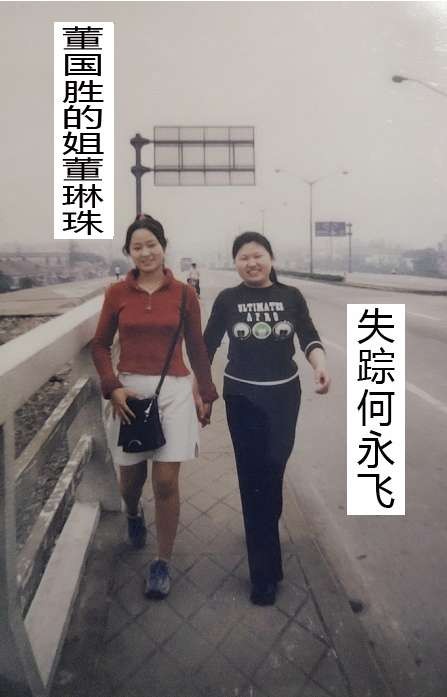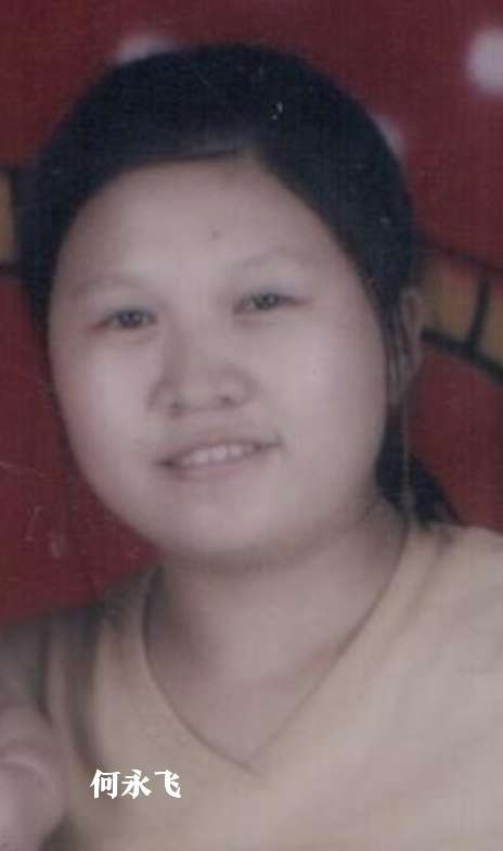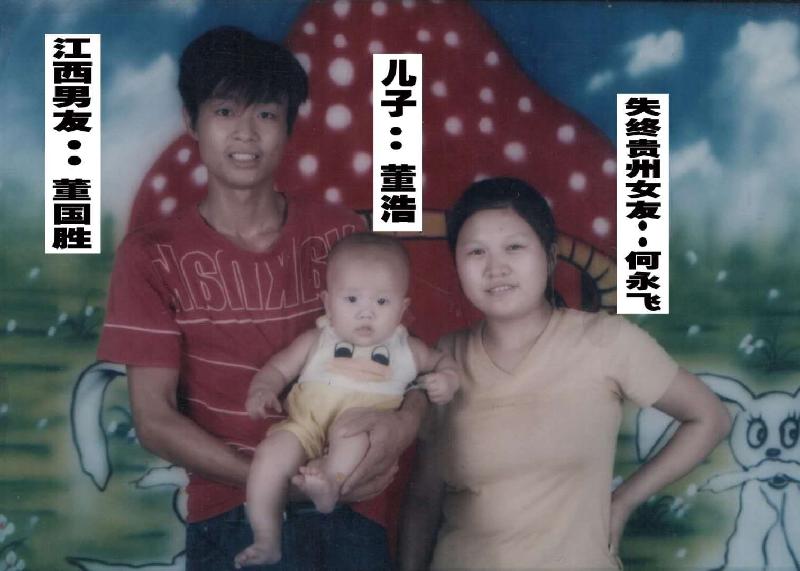 何永飞,女,1981年9月初四出生,原籍贵州省遵义市红花岗区松林镇奇龙村人。2001年在广州打工,认识一位家住江西省鄱阳县四十里街镇共和村青年小伙子董国胜,2002年董国胜将何永飞回飞江西鄱阳老家,并生育一男孩,名叫董浩。2004年5月10日,董国胜的姐姐董琳珠(江西上饶鄱阳县磨刀石乡磨刀石村人)来信说,何永飞已经失踪。家人收到信后,赶往江西上饶鄱阳寻找无果。不知道他们之间到底发生了什么?现在也打听不到董家人在何处?至今十六年我们一直在寻找,何永飞已经蒸发在人间。