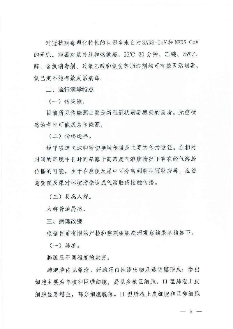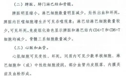 在病理改变方面,方案指出,根据目前有限的尸检和穿刺组织病理观察结果,除肺脏呈不同程度的实变外,脾脏、肺门淋巴结和骨髓,心脏和血管,肝脏和胆囊,肾脏,脑组织等也出现病理改变。如,脾脏明显缩小,心肌细胞可见变性、坏死等。